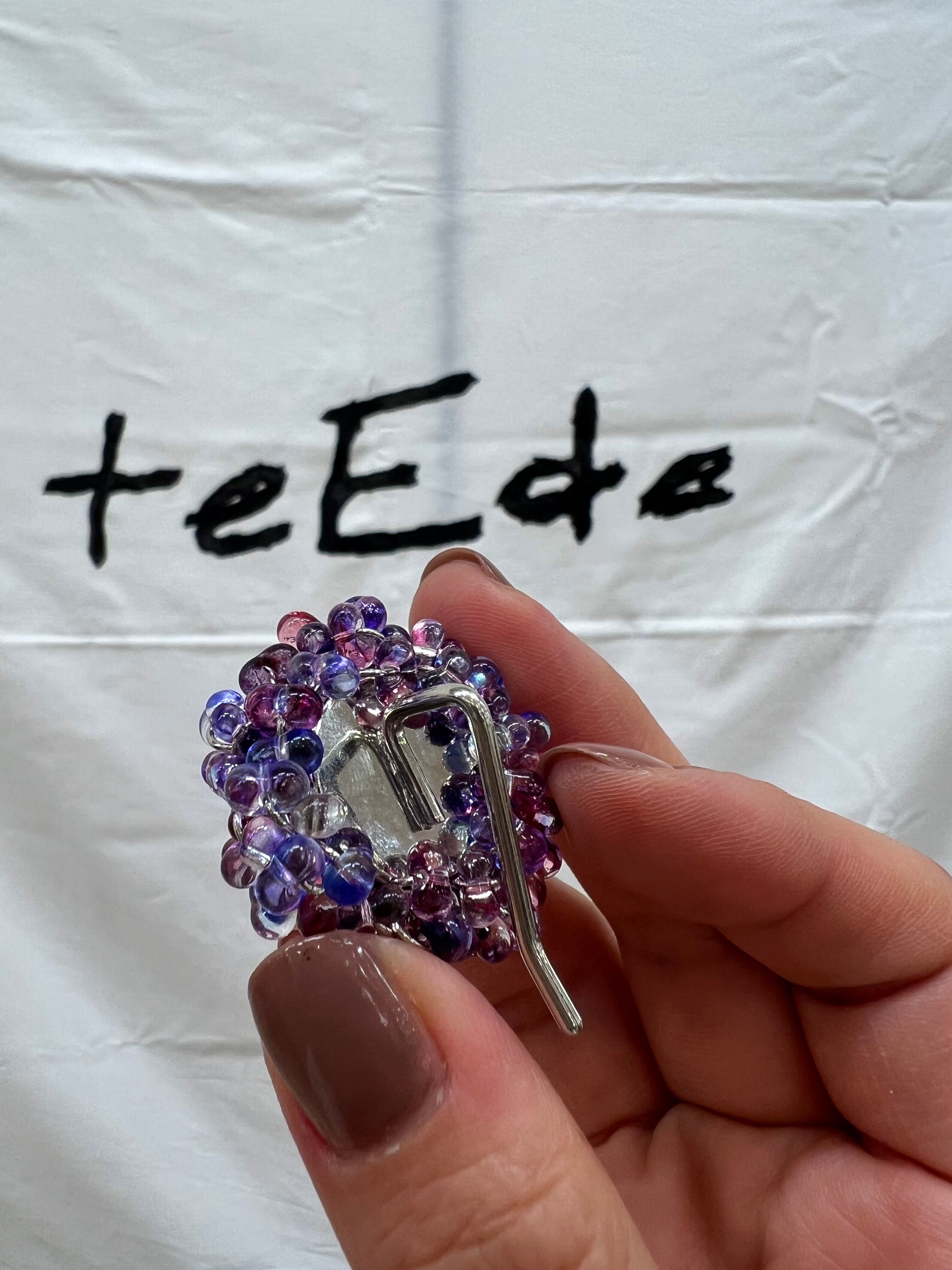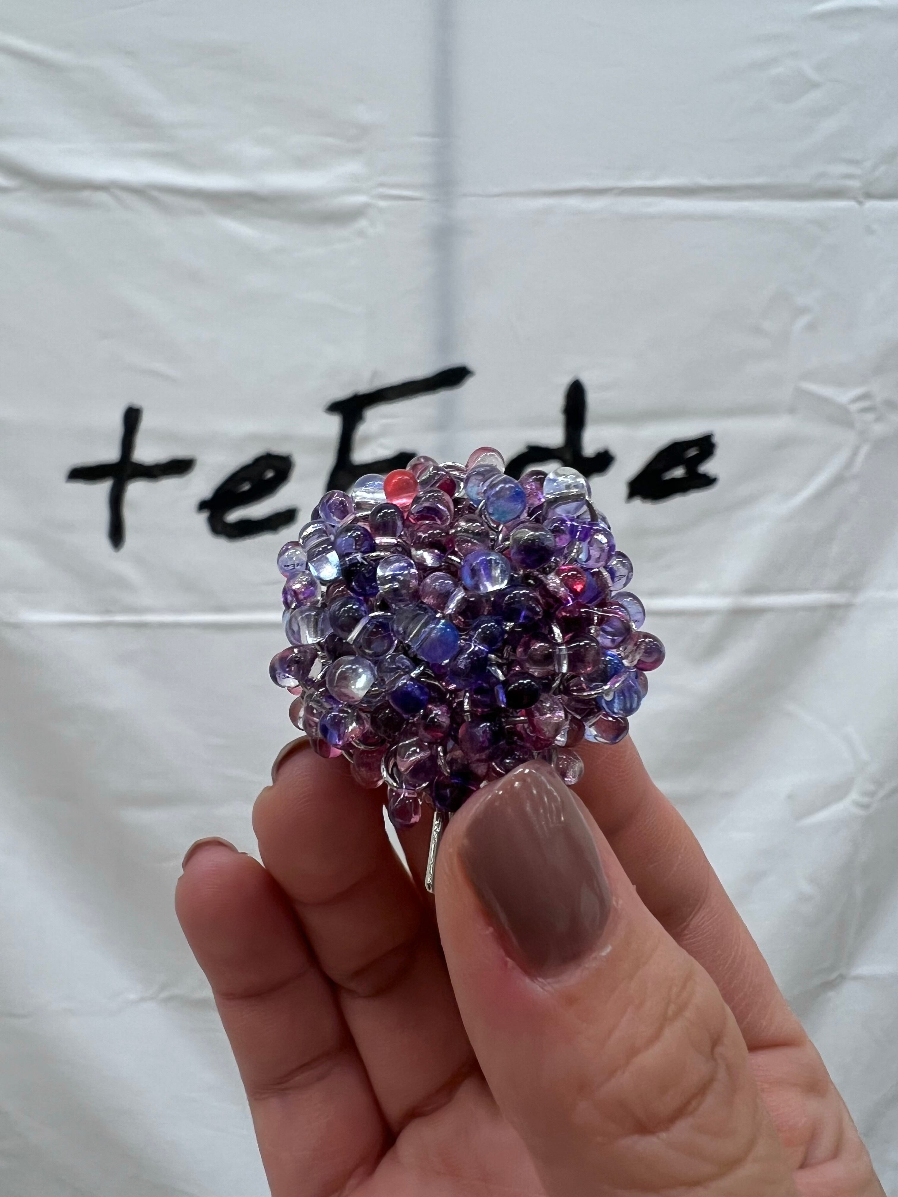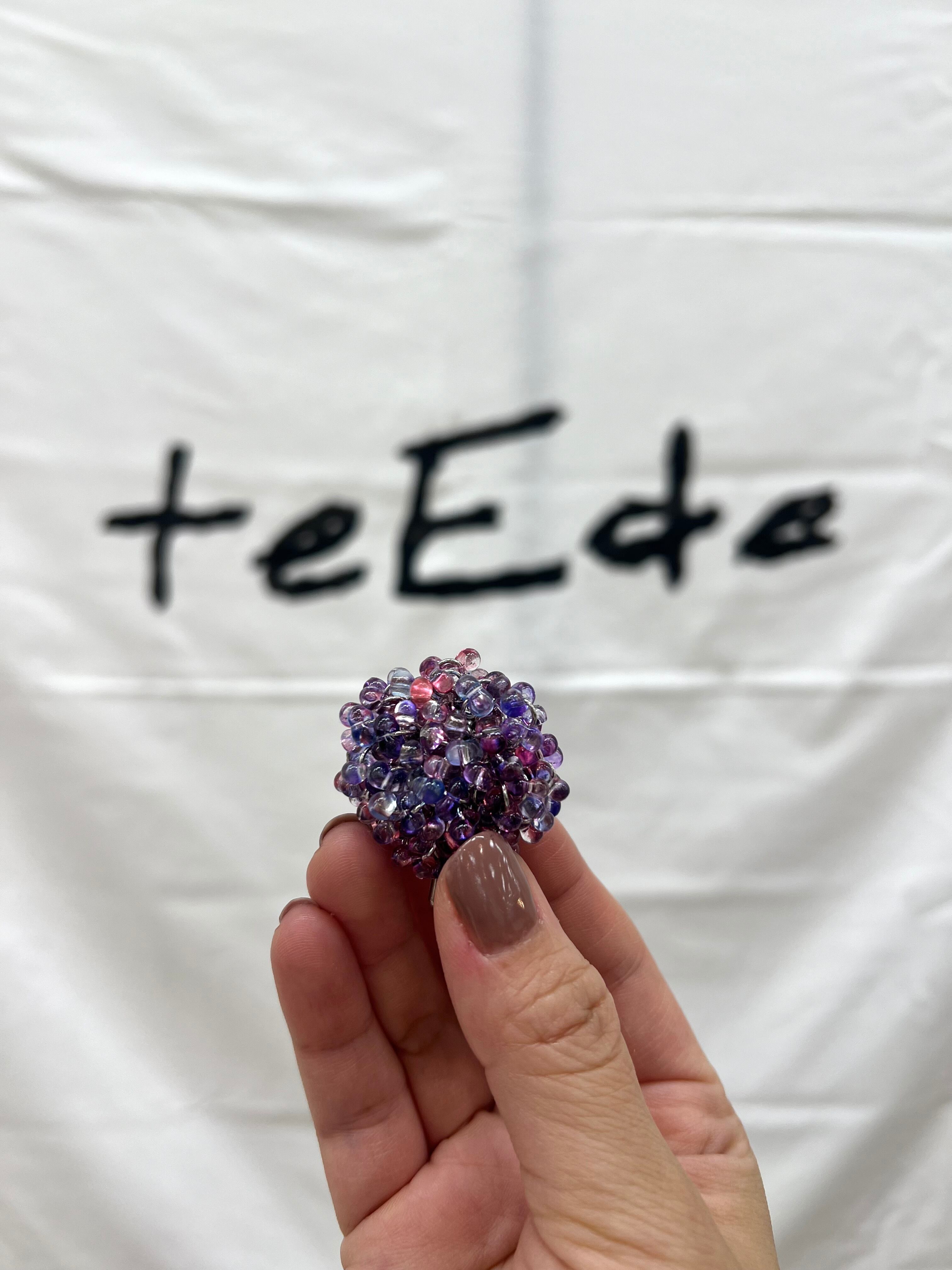 ぷっくりとしたビーズが目を惹き、動くとつぶつぶが少しだけ揺れて光の反射できらめきます。