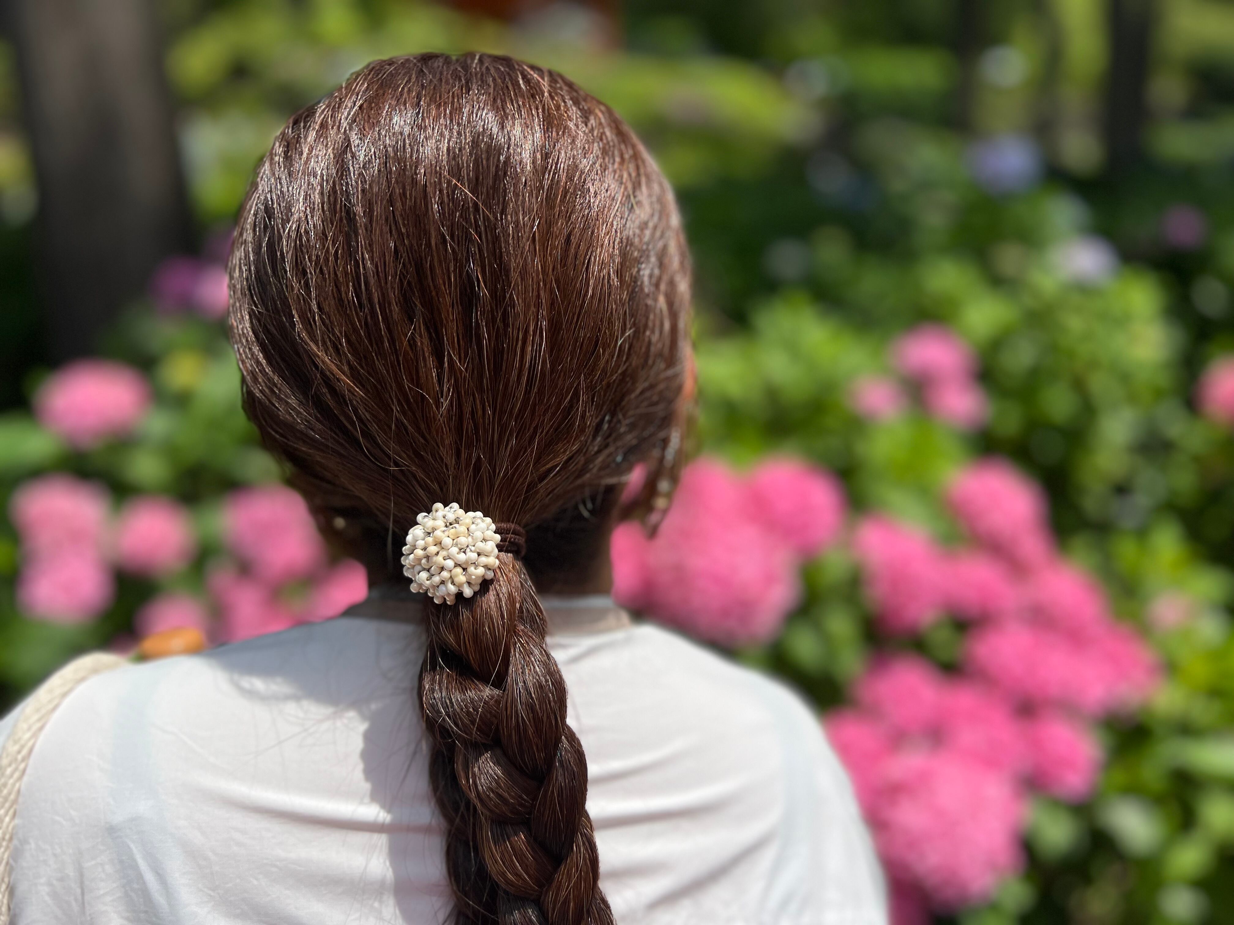 ヘアゴムで束ねた髪の毛のゴムの部分にフックを差し込んで使用します。